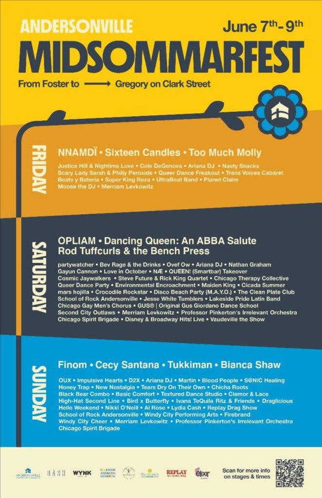 The first show on Saturday is a headlining set with OPLIAM on the Center Stage at the 59th Annual Midsommarfest in Andersonville. We go on at 9PM to close out the evening, and I’m also looking forward to taking in the other musicians, artists, and vendors that will populate the streets of Chicago earlier in the day.